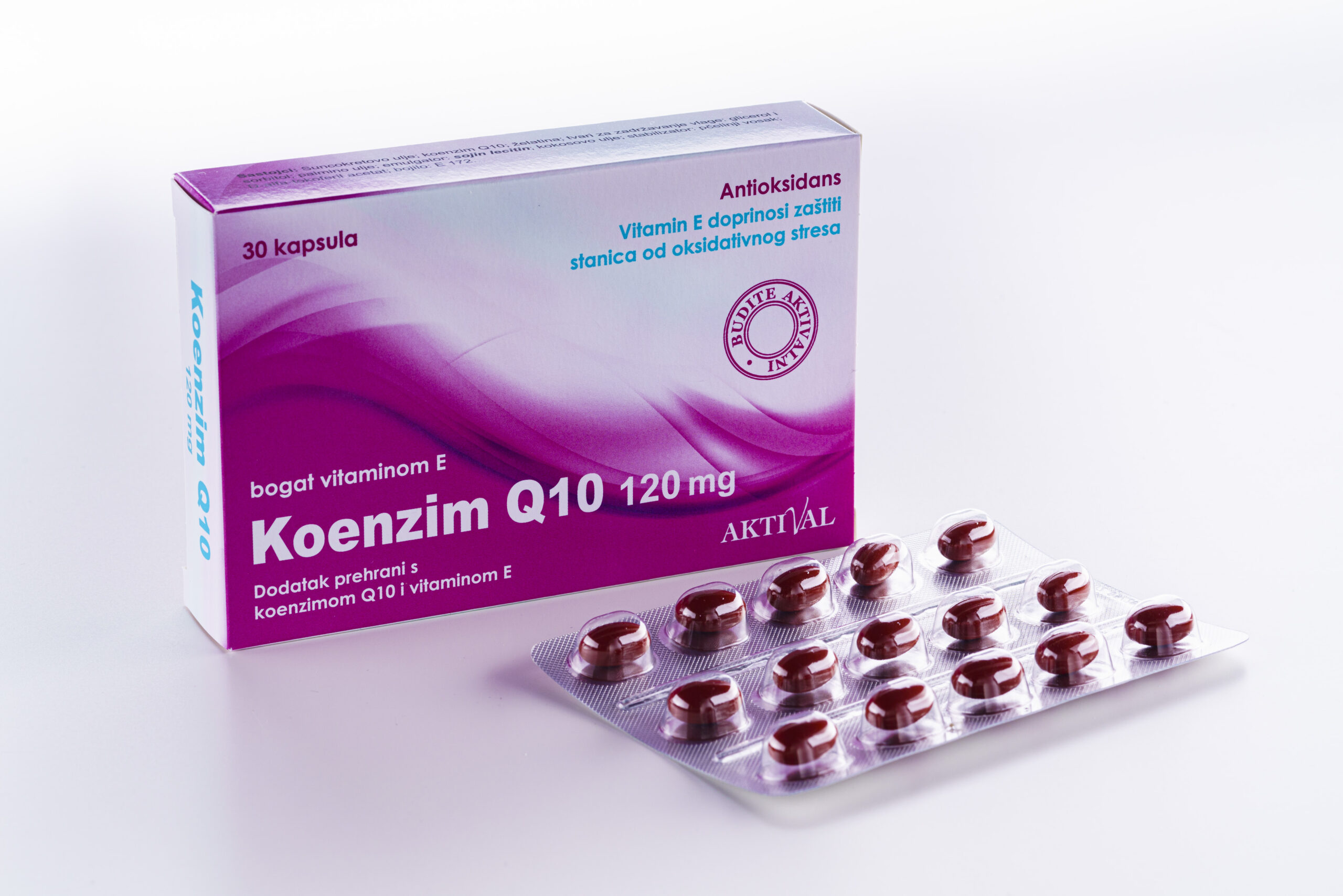 Aktival Koenzim Q10 120 mg s vitaminom E je dodatak prehrani koji kombinira koenzim Q10 i vitamin E, poznate po svojim antioksidativnim svojstvima. Ovaj proizvod pomaže u zaštiti stanica od oksidativnog stresa, što može doprinijeti održavanju zdravlja srca i krvnih žila te općem vitalitetu organizma. Namijenjen je osobama koje žele podržati svoju energiju i opće zdravlje.