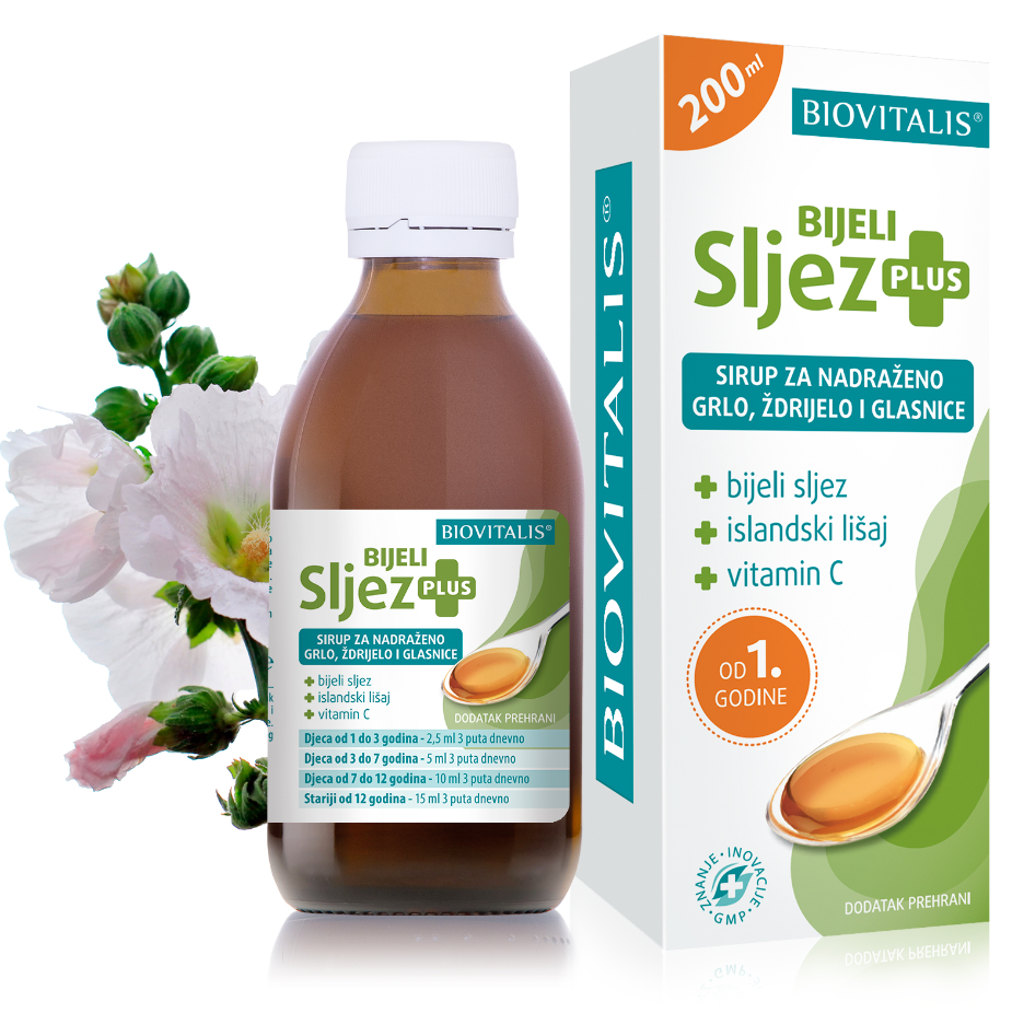 Bijeli Sljez Plus sirup je dodatak prehrani koji sadrži učinkovite količine suhih ekstrakata korijena bijelog sljeza i islandskog lišaja, obogaćen vitaminom C. Namijenjen je za ublažavanje nadraženog grla, ždrijela i glasnica, te doprinosi normalnoj funkciji imunološkog sustava. Pogodan je za djecu od 1. godine života i odrasle osobe, a ne sadrži konzervanse, alkohol, gluten, umjetna bojila ni arome.
