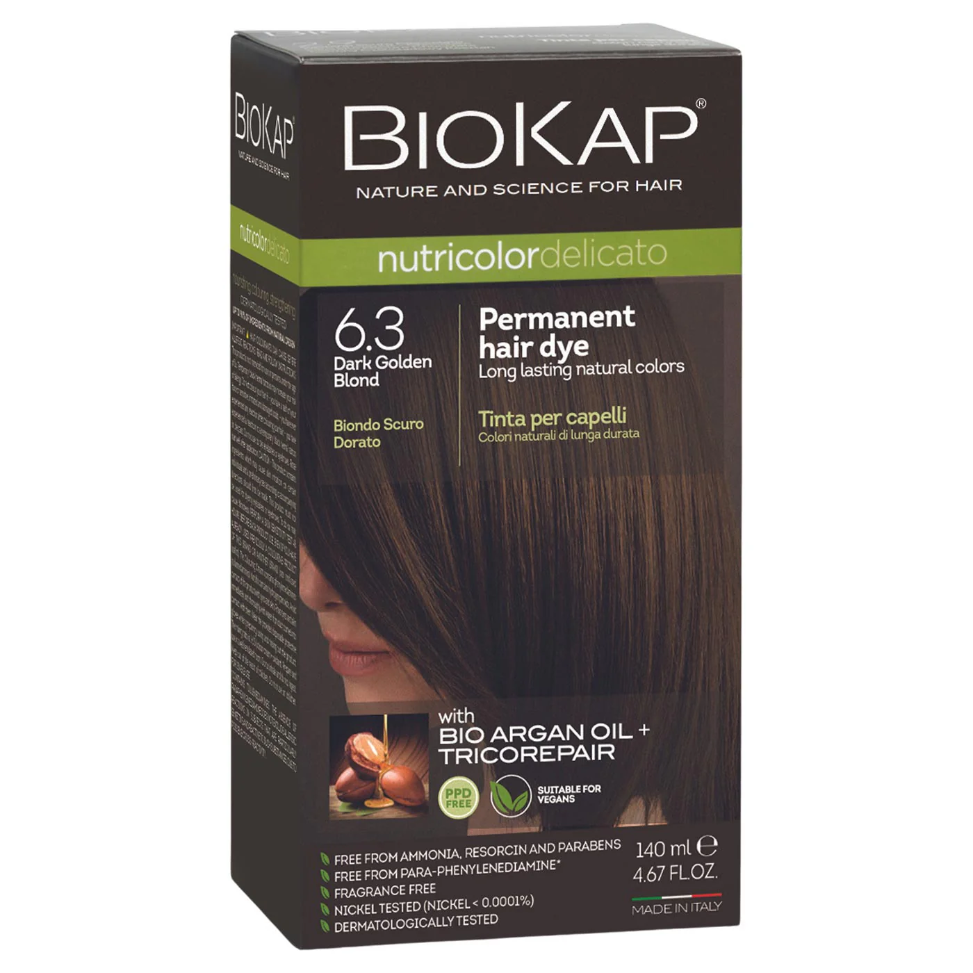 BioKap Nutricolor Delicato 6.3 Dark Golden Blond je trajna boja za kosu koja pruža prirodnu nijansu tamnog zlatnog plavuša. Ova boja ne sadrži amonijak, resorcin, parabene ni para-fenilendiamin (PPD), čineći je pogodnom za osjetljivo vlasište. Obogaćena je arganovim uljem iz ekološkog uzgoja, poznatim po svojim hranjivim svojstvima, te Tricorepair® kompleksom koji sadrži rižine proteine za restrukturiranje kose, derivat vrbe za zaštitu boje i voćne lipofilne kiseline koje štite vlasište tijekom bojenja. Ova kombinacija sastojaka osigurava dugotrajan i sjajan rezultat bojenja, istovremeno njegujući kosu.