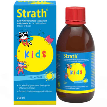 Strath Kids je tekući dodatak prehrani namijenjen djeci, temeljen na plazmoliziranom biljnom kvascu s prirodnim vitaminom D. Ovaj proizvod podržava imunološki sustav djece, doprinosi zdravom rastu i razvoju kostiju te održavanju normalnih kostiju i zubića. Pogodan je za djecu od 1. godine života, školarce i adolescente.