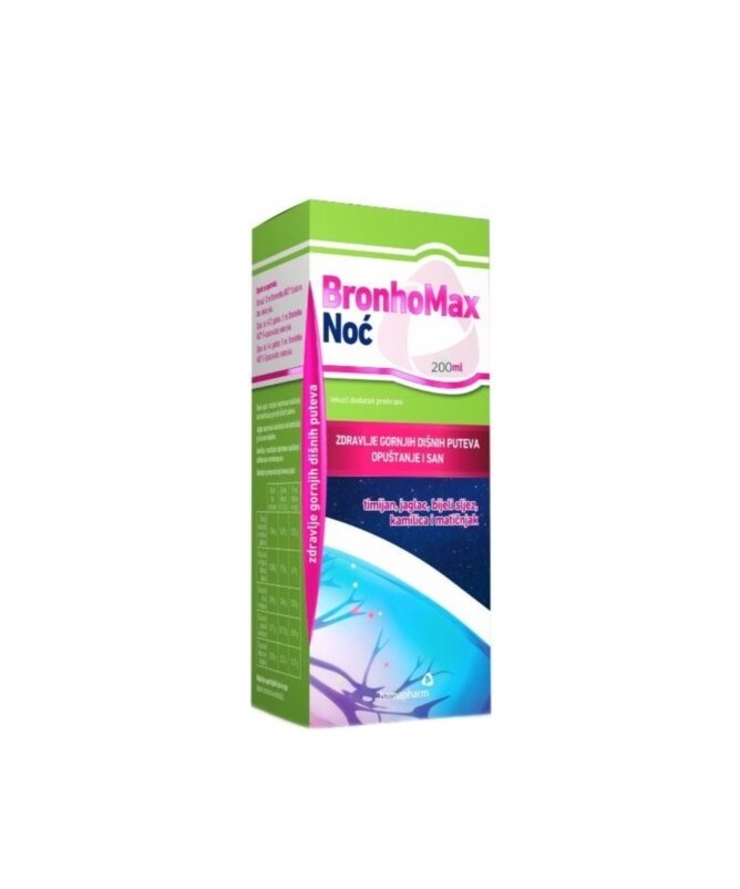 BronhoMax Noć je tekući dodatak prehrani u obliku sirupa koji sadrži kombinaciju biljnih ekstrakata namijenjenih olakšanju disanja i održavanju normalnog sna. Proizvod je posebno formuliran za noćnu primjenu, pružajući trostruko djelovanje: smiruje nadražaj gornjih dišnih putova, razrjeđuje i čisti sluz te opušta i održava normalan san. Blagog je okusa s aromom jagode, što olakšava primjenu, osobito kod djece. Namijenjen je djeci od 4 godine i odraslima koji žele podržati zdravlje svojih dišnih puteva tijekom noći.