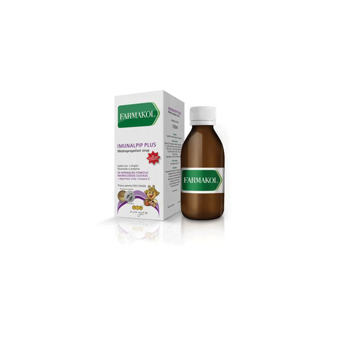FK IMUNALPIP PLUS SIRUP 150 ML/PIP je medno-propolisni sirup namijenjen jačanju imunološkog sustava. Sadrži kombinaciju prirodnih sastojaka poput meda, propolisa, matične mliječi, koncentriranog soka aronije, vitamina C i cinka. Ovi sastojci doprinose normalnoj funkciji imunološkog sustava, pomažu u prevenciji i terapiji akutnih stanja poput prehlada, virusnih i bakterijskih infekcija te alergija. Sirup je bez konzervansa i alkohola, što ga čini pogodnim za djecu od 1. godine i odrasle.