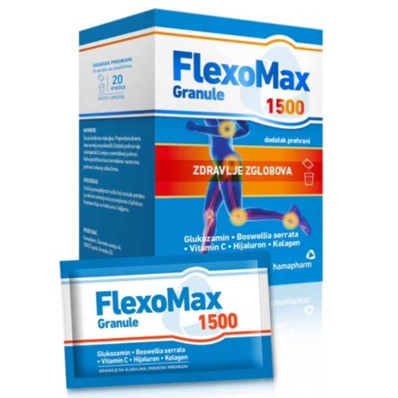 FlexoMax 1500 je dodatak prehrani namijenjen održavanju normalne funkcije zglobova, hrskavice i kostiju. Svaka vrećica sadrži 1500 mg glukozamin sulfata, 40 mg bosveličke kiseline iz smole indijskog tamjanovca (Boswellia serrata), 20 mg hijaluronske kiseline, 80 mg vitamina C i 50 mg kolagena. Ovi sastojci klinički dokazano doprinose zdravlju zglobova i vezivnog tkiva. Proizvod je dostupan u praktičnom pakiranju od 20 vrećica koje se lako otapaju u vodi i imaju ugodan okus limuna. Preporučuje se uzimanje jedne vrećice dnevno, najbolje uz obrok.