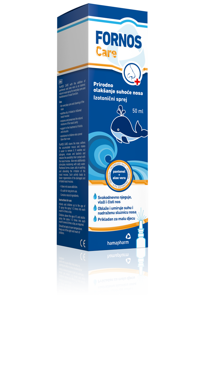 ForNos Care je izotonični prirodni sprej za nos s dodatkom pantenola i aloe vere, namijenjen za svakodnevnu njegu i održavanje funkcije nosa. Koncentracija soli usklađena je s prirodnom razinom u tijelu, što djeluje umirujuće na nosnu sluznicu.