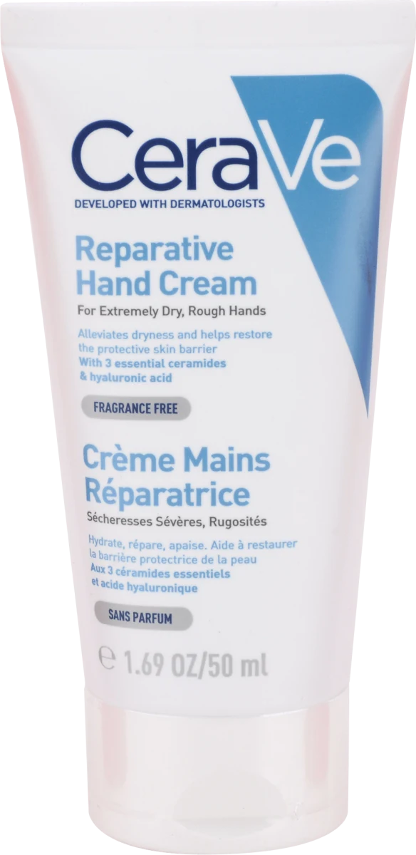 CeraVe Obnavljajuća krema za ruke 50 ml je nemasna krema namijenjena za njegu suhe i ispucale kože ruku. Formulirana je s tri esencijalna ceramida i hijaluronskom kiselinom, koji pomažu obnoviti i održati prirodnu barijeru kože, pružajući 24-satnu hidrataciju. Krema se brzo upija, ne ostavlja masni sloj i pogodna je za svakodnevnu upotrebu. Bez mirisa, što je čini pogodnom za osobe s osjetljivom kožom. Razvijena u suradnji s dermatolozima, ova krema pomaže u obnavljanju zaštitne barijere kože ruku, čineći ih mekim i zdravim.