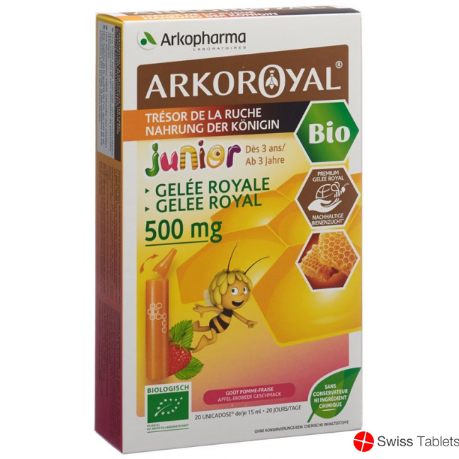 Arkoroyal® Junior je tekući dodatak prehrani namijenjen djeci, koji kombinira certificirane ekološki proizvedene aktivne sastojke – matičnu mliječ i med. Dostupan je u praktičnim plastičnim monodozama, bez bojila, konzervansa i alkohola. Proizvod je dizajniran za djecu stariju od 3 godine, pružajući prirodnu podršku imunološkom sustavu i općem zdravlju.