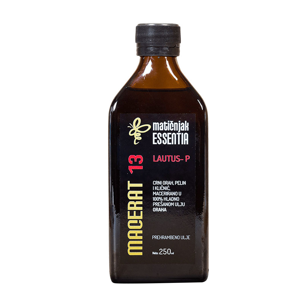 Macerat 13 je biljni pripravak koji kombinira crni orah, gorki pelin i klinčić, macerirane u hladno prešanom ulju oraha. Ovaj pripravak poznat je po svojim antiparazitskim svojstvima, učinkovito čisti organizam od parazita, glista i gljivica. Osim toga, doprinosi smanjenju visokog krvnog tlaka i povišenog kolesterola te čisti krv od toksina. Preporučuje se kao osnova antiparazitnog programa, s ciljem čišćenja organizma i poboljšanja općeg zdravlja. Preporučena doza je jedna čajna žličica nakon obroka, tri puta dnevno, tijekom šest tjedana, dva puta godišnje.
