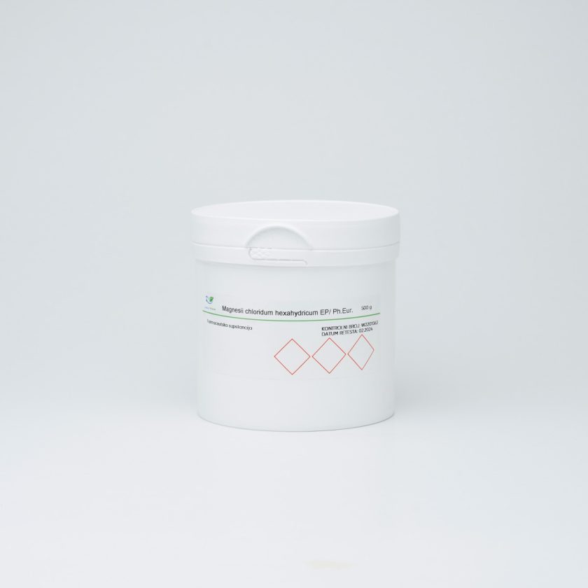 Magnezij klorid heksahidrat je kemijski spoj s formulom MgCl₂·6H₂O, poznat po svojoj primjeni u farmaceutskoj industriji, analitičkoj kemiji i kao dezinficijens. Dostupan je u pakiranjima od 500 g, a njegova čistoća zadovoljava standarde farmakopeje (Ph. Eur., BP, USP).