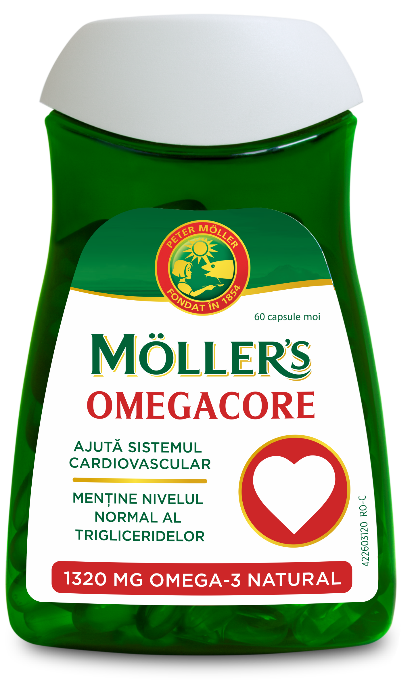 Möller’s OMEGACORE je dodatak prehrani koji sadrži prirodne Omega-3 masne kiseline u obliku triglicerida, dobivene iz ribljeg ulja. Svaka dnevna doza od dvije kapsule pruža 1320 mg Omega-3 masnih kiselina, uključujući 480 mg DHA (dokozaheksaenska kiselina) i 640 mg EPA (eikozapentaenska kiselina). Ove komponente doprinose normalnoj funkciji srca, održavanju normalne razine triglicerida u krvi i krvnog tlaka, te normalnoj funkciji mozga i vida. Proizvod je namijenjen osobama koje žele podržati kardiovaskularno zdravlje i opće dobrostanje.