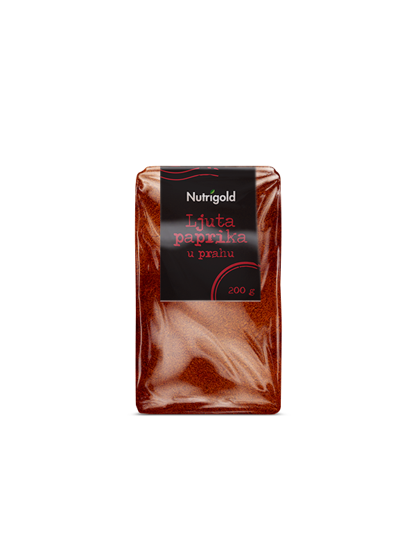 Ljuta paprika u prahu brenda Nutrigold je začin koji se dobiva mljevenjem potpuno zrelih crvenih paprika. Karakterizira je bogat, ljut okus s blagim zemljanim aromama. Ovaj začin je idealan za obogaćivanje raznih jela, poput toplih variva, gulaša, a može se koristiti i u kombinaciji s nekim slatkim jelima. Proizvod je pakiran u količini od 200 grama, što ga čini praktičnim za kućnu upotrebu.