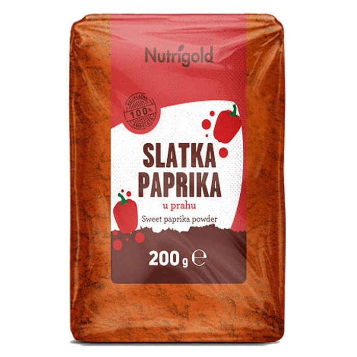 Slatka paprika u prahu od 200 g, proizvedena od Capsicum L. Paprika daje jelu osebujnu crvenu boju i poseban okus.