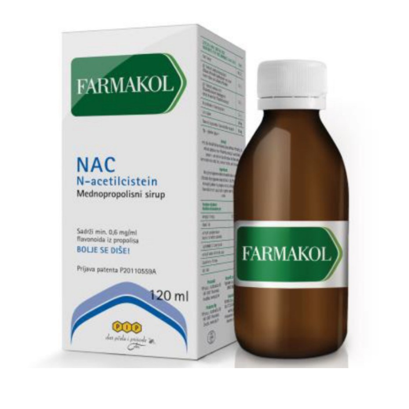 Farmakol NAC sirup je mednopropolisni sirup koji sadrži N-acetilcistein, ekstrakte korijena bijelog sljeza i anisa. Namijenjen je kao potpora dišnom sustavu tijekom respiratornih infekcija s pojačanim lučenjem sekreta. Djeluje mukolitički, smanjuje viskoznost sluzi u dišnim putevima, olakšava iskašljavanje i štiti dišne puteve od lokalnog nadražaja. Također, poboljšava funkciju imunološkog sustava. Sirup je bez konzervansa i alkohola, te je namijenjen djeci od 3. godine i odraslima.