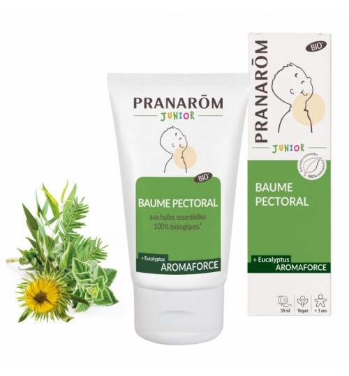 PRANA-AROMAFORCE BALZAM PRSA JUNIOR 50ML je umirujući balzam namijenjen djeci od 3 godine starosti za olakšavanje disanja kod respiratornih infekcija, prehlada i gripa. Obogaćen je 100% organskim eteričnim uljima eukaliptusa, mažurana, timijana, ravintsare, poljske metvice i omana. Balzam stvara blagotvorni učinak topline i potiče prirodnu obranu organizma. Dermatološki je ispitano i pogodno za djecu od 3 godine starosti.