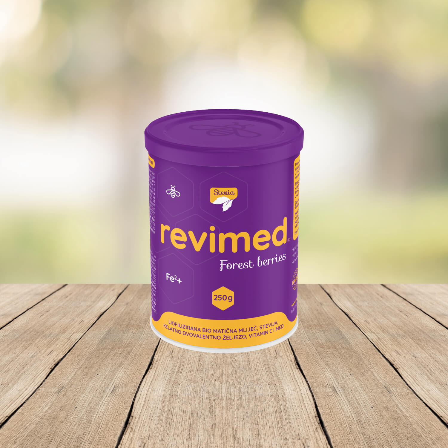 REVIMED® Stevia Fe je prirodni dodatak prehrani namijenjen obogaćivanju prehrane željezom, vitaminom C, BIO matičnom mliječi i stevijom. Proizvod je formuliran za pripremu napitka s prirodnim okusom šumskog voća, idealnog za osobe s povećanim potrebama za željezom, poput trudnica, dojilja, starijih osoba, djece starije od 12 mjeseci, sportaša i dijabetičara. Željezo doprinosi normalnom stvaranju crvenih krvnih stanica i hemoglobina, smanjenju umora i iscrpljenosti te normalnoj kognitivnoj funkciji. Vitamin C povećava apsorpciju željeza i doprinosi normalnoj funkciji imunološkog sustava.