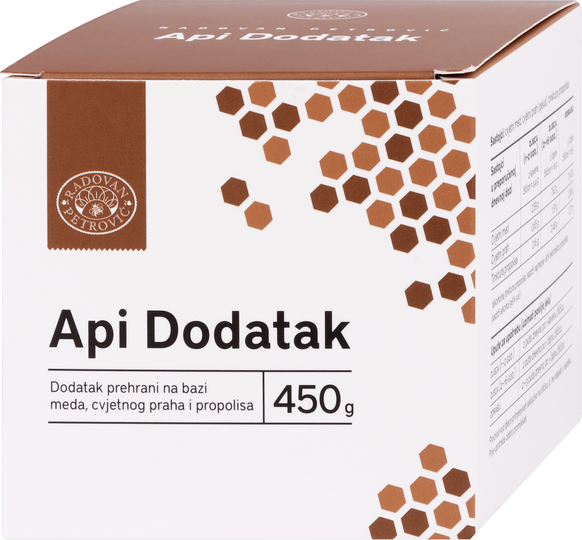 Api Dodatak Plus je dodatak prehrani koji kombinira prirodnu vitaminsku bazu s visokom koncentracijom ekstrahiranog propolisa. Cvjetni prah sadrži veliku količinu aminokiselina, bjelančevina, različite vitamine, minerale, enzime i ugljikohidrate, što potiče obnovu organizma i jača njegovu sposobnost samoobrane. Propolis djeluje kao prirodni antibiotik. Svi se sastojci vežu i apsorbiraju prirodnim putem, djelujući izravno i s ubrzanom učinkovitošću. Proizvod je namijenjen za povećanje vitalnosti organizma, osobito u slučajevima smanjenog imuniteta, kroničnih upala ili nakon operativnih zahvata. Preporučuje se za dugotrajnu upotrebu, od 4 do 6 mjeseci, a u zahtjevnijim stanjima i do 2 godine.