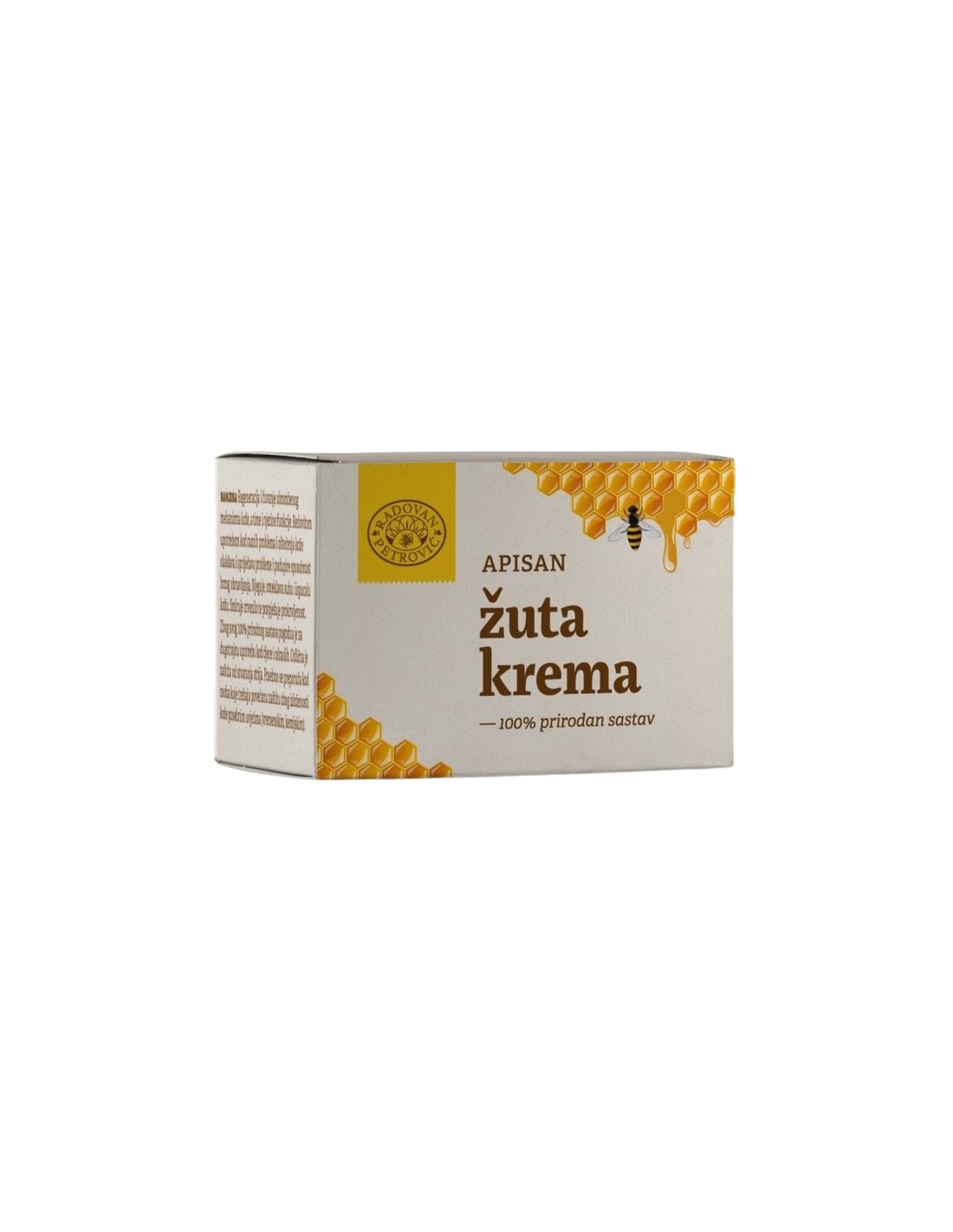 Žuta krema je potpuno prirodna krema izrađena ručno od nerafiniranog pčelinjeg voska hrvatskih pčelara, djevičanskog maslinovog ulja i eteričnog ulja ružmarina. Pogodna je za sve uzraste. 100% prirodan sastav. Namjena: Regeneracija i čuvanje obrambenog mehanizma kože, a time i njezine funkcije.