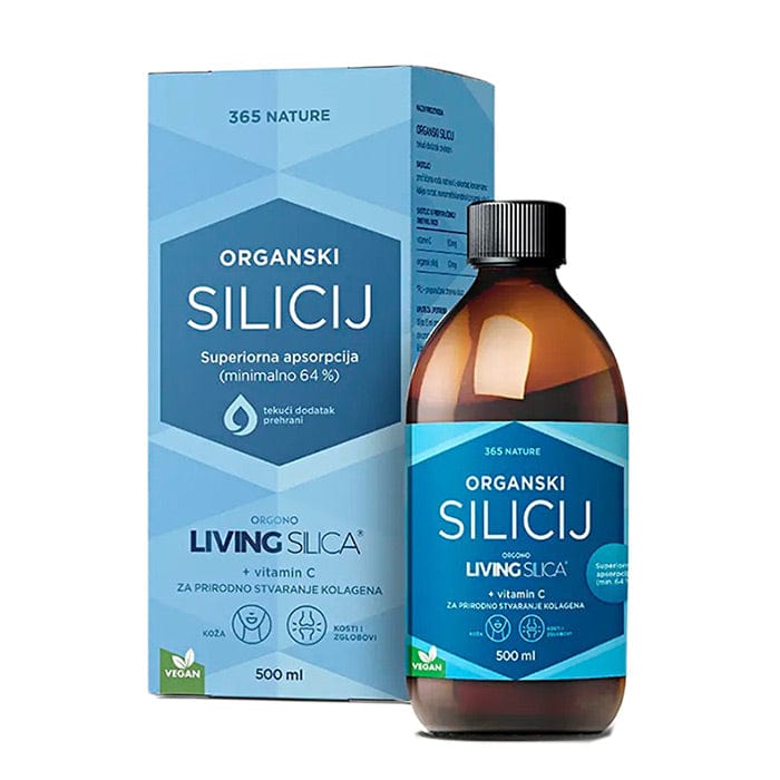 SILICIJ ORGANSKI 500ML 365 NATURE je tekući dodatak prehrani koji sadrži patentirani oblik organskog silicija, poznat kao Living Silica®, ekstrahiran iz kvarca. Ovaj proizvod je formuliran za poticanje sinteze kolagena u tijelu, što doprinosi zdravlju kože, kose, noktiju, hrskavice, zglobova i drugih vezivnih tkiva. Također, doprinosi normalnom metabolizmu stvaranja energije, funkcioniranju živčanog sustava, imunološkom sustavu te smanjenju umora i iscrpljenosti. Visoka bioraspoloživost omogućuje superiornu apsorpciju, čineći ga učinkovitim dodatkom prehrani za podršku cjelokupnom zdravlju.