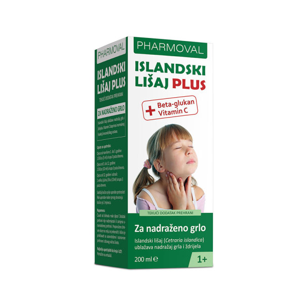 Islandski lišaj Plus je sirup namijenjen ublažavanju simptoma suhog i nadraženog grla. Sadrži ekstrakt islandskog lišaja (Cetraria islandica) koji umiruje nadraženo grlo i ždrijelo, te vitamin C koji doprinosi normalnoj funkciji imunološkog sustava. Proizvod je ugodnog okusa i pogodan za djecu od 1 godine i odrasle. Dostupan je u pakiranju od 200 ml.