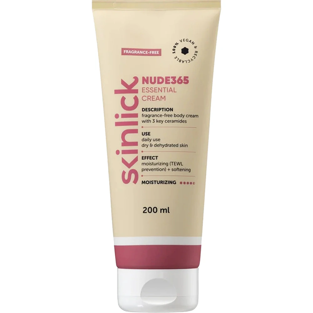 Skinlick Nude365 Essential Cream je bogata krema za njegu suhe kože tijela koja kombinira tri ključna ceramida s karite maslacem, uljem slatkog badema i pantenolom. Bez parfema, ova krema je pogodna za osjetljivu kožu i pruža intenzivnu hidrataciju te obnavlja prirodnu barijeru kože. Idealna je za svakodnevnu upotrebu, posebno nakon tuširanja ili depilacije, ostavljajući kožu mekanom i podatnom bez ljepljivog osjećaja.