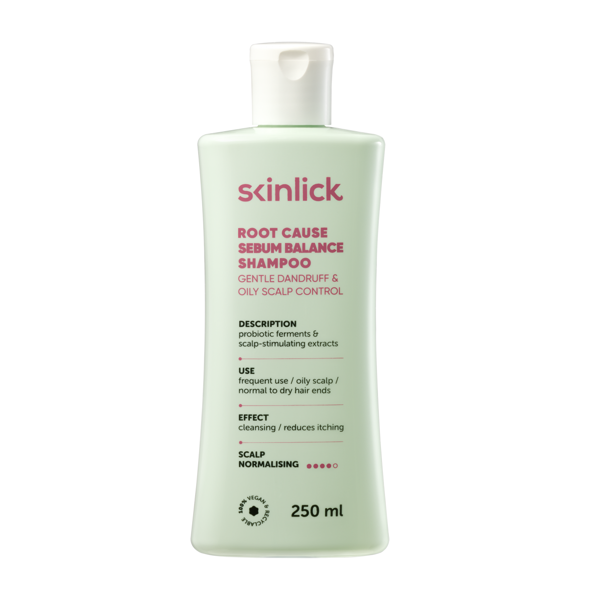 Skinlick Root Cause Sebum Balance šampon je blagi šampon za regulaciju masnog vlasišta koji tretira perut, a istovremeno ne isušuje normalnu ili suhu kosu. Formula s probiotičkim fermentima, pirokton olaminom i koprivom uravnotežuje mikrobiom, dubinski čisti i smanjuje svrbež, dok avokado i fermenti riže djeluju njegujuće na vlasište. U dodiru s vodom, šampon se pretvara u laganu, nježnu pjenu prikladnu za učestalo korištenje. Sadrži blagi hipoalergeni miris s voćno-cvjetnim notama.