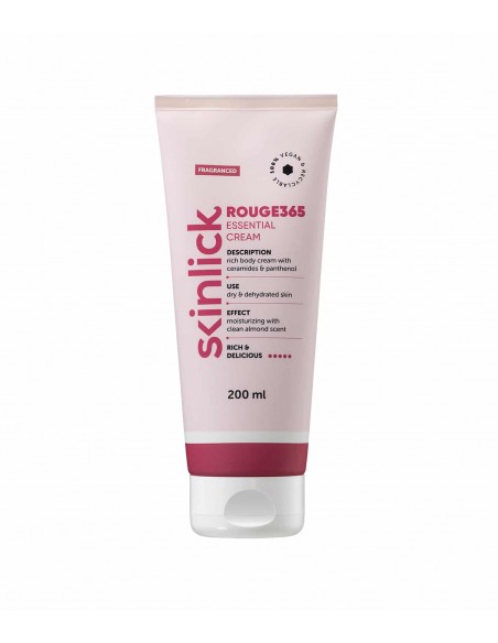 Skinlick Rouge365 Essential Cream je bogata krema za njegu suhe kože tijela koja sadrži ceramide, pantenol i mirisne note koje evociraju puder, badem i bijelo cvijeće. Ceramidi su lipidi važni za očuvanje vlažnosti i prirodne elastičnosti kože, štiteći i obnavljajući je, zadržavajući vlagu i smanjujući suhoću. Kremasta, gusta tekstura ove kreme održava kožu njegovano, mekom i podatnom cijeli dan. Pakiranje je reciklabilna tuba od 200 ml.