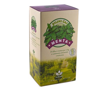 Čaj od mente u filtar vrećicama koji sadrži 100% list mente (Menthae folium). Pakiranje sadrži 25 filtar vrećica, svaka od 1,5 g, ukupne neto mase 37,5 g. Čaj je poznat po svojim ljekovitim svojstvima, osobito u olakšavanju probavnih smetnji.