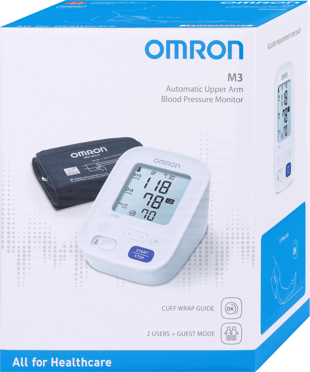 Automatski tlakomjer za nadlakticu s Intellisense tehnologijom koja omogućuje brzo i precizno mjerenje krvnog tlaka i srčanog pulsa. Ima mogućnost pohrane podataka za dva korisnika, s 2 x 60 memorija s datumom i vremenom mjerenja. Detektira nepravilnosti srčanog ritma i pruža indikator pravilnog postavljanja manžete. Napaja se s 4 AA baterije ili opcijskim strujnim adapterom. Garancija je 5 godina na uređaj i 2 godine na manžetu, cijev manžete i adapter.