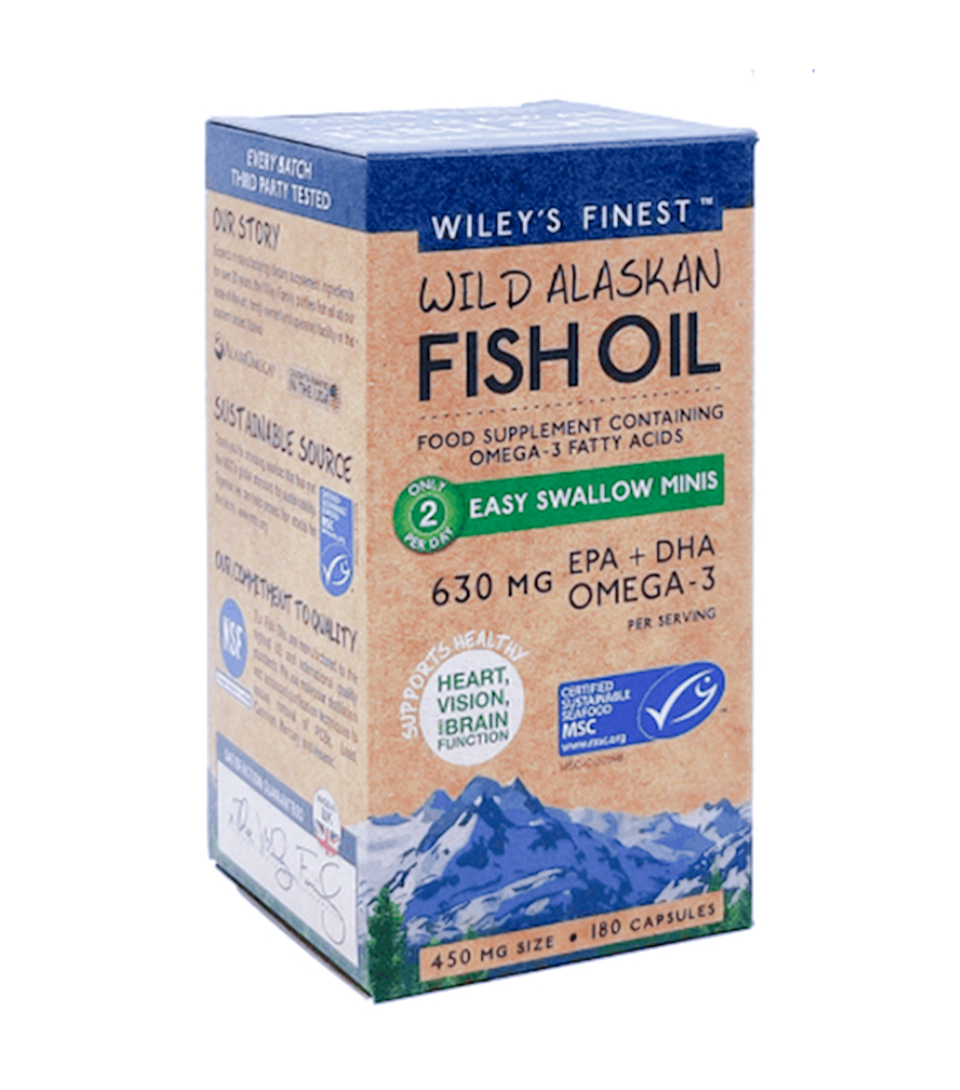 Wiley’s Finest Wild Alaskan Fish Oil Easy Swallow Minis su koncentrirani dodaci prehrani u obliku malih kapsula koje sadrže visok udio omega-3 masnih kiselina EPA (eikosapentaenojska kiselina) i DHA (dokosaheksaenojska kiselina). Svaka doza od dvije kapsule pruža 630 mg EPA i DHA, što čini 55% manju veličinu od standardnih 1000 mg ribljeg ulja, ali s 30% većim udjelom omega-3 po kapsuli. Ovaj proizvod je namijenjen podršci općem zdravlju, uključujući zdravlje srca, mozga i imunološkog sustava. Kapsule su izrađene od održivo ulovljenog aljaškog poloka (Gadus chalcogrammus) i proizvedene u cGMP (current Good Manufacturing Practice) rafineriji. Preporučena dnevna doza je dvije kapsule s hranom. Proizvod je bez glutena, šećera, umjetnih boja i okusa, te ne sadrži kukuruz, mliječne proizvode, orašaste plodove, sezam, školjke, soju, škrob, pšenicu ili kvasac. Čuvati izvan dohvata djece. Prije upotrebe posavjetujte se s liječnikom ako ste trudni, dojite, imate medicinsko stanje ili uzimate bilo kakve lijekove, uključujući antikoagulanse ili NSAID lijekove, ili planirate medicinske ili kirurške zahvate.