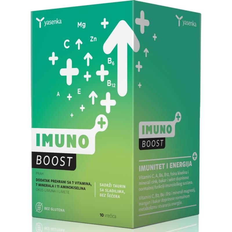 YASENKA IMUNO BOOST je dodatak prehrani namijenjen jačanju imunološkog sustava. Sadrži kombinaciju vitamina, minerala i aminokiselina koji podržavaju prirodnu obranu organizma. Dostupan je u pakiranju od 10 vrećica, svaka sadrži 13,5 g praška za pripremu napitka okusa limuna i limete.
