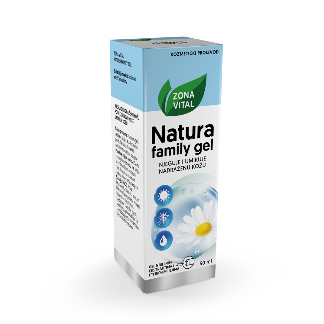 ZONA VITAL Natura Family Gel je gel namijenjen njezi nadražene kože, poticanju njezine obnove te umirivanju kože nakon predugog izlaganja suncu. Svojim djelatnim tvarima objedinjuje djelotvornost više različitih biljnih ekstrakata i eteričnih ulja, pružajući umirujuće i repelentno djelovanje. Idealno je za njegu osjetljive dječje kože.